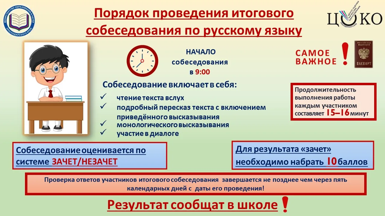 Напоминаем, что наличие результата «зачет» за итоговое собеседование по русскому языку является одним из условий допуска к прохождению ГИА.