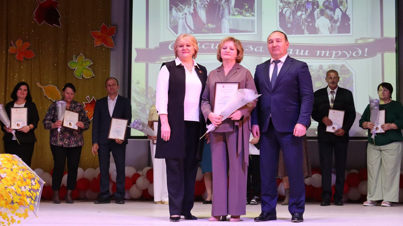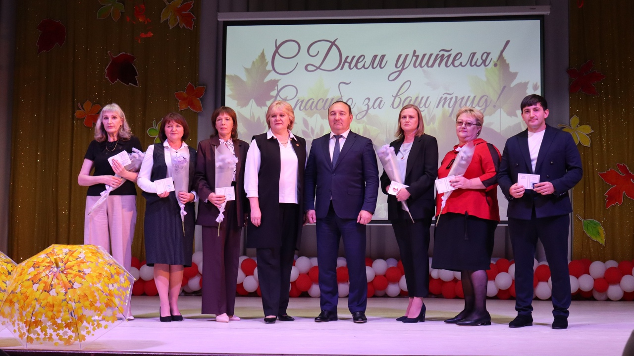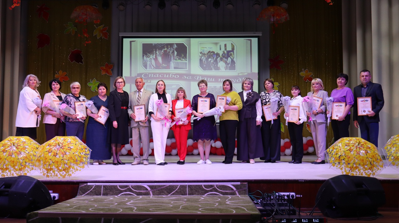 Поздравили представителей сферы образования глава района И.А. Гузев, первый заместитель главы Е.И. Поступаева, начальник управления образованием В.О. Богунова, председатель профсоюза отрасли О.Н. Бельчакова. В связи с профессиональными праздниками заслуги педагогов и работников отрасли отмечены наградами: нагрудными знаками, почетными грамотами, благодарностями и благодарственными письмами различных уровней. По традиции, обучающиеся, воспитанники Дома творчества и Центра творчества подготовили музыкальные и танцевальные подарки для дорогих наставников.